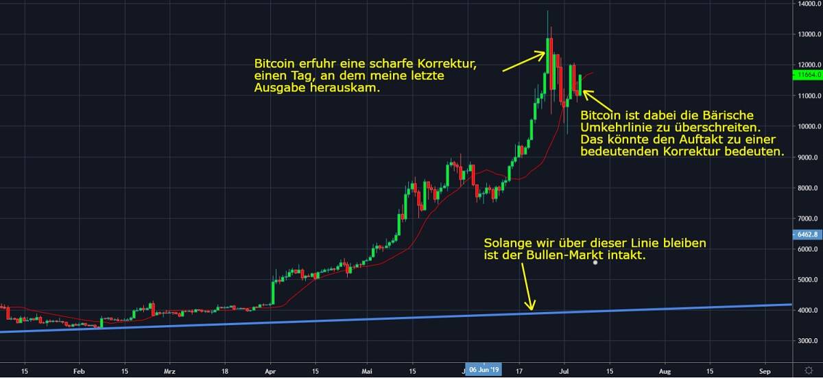 Als ich die Ausgabe der letzten Woche fertiggestellt habe, wurde keine 24 Stunden zuvor bei Bitcoin ein umfangreiches Retracement durchgeführt – von 14.000 $ auf etwa 10.400 $. Aber fast die ganze Action lief Intraday ab. Es war also zu früh, um die von uns erwartete schärfere Korrektur als bestätigt zu kommunizieren.