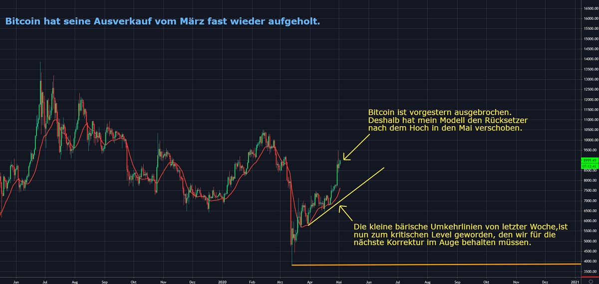Das Gewinnpotential aus dem bevorstehenden Halvingereignis und der anschließenden Kursexplosion wird weitaus größer sein, wenn wir zu niedrigeren Kursen kaufen nachdem wir ein bestätigtes Signal haben.