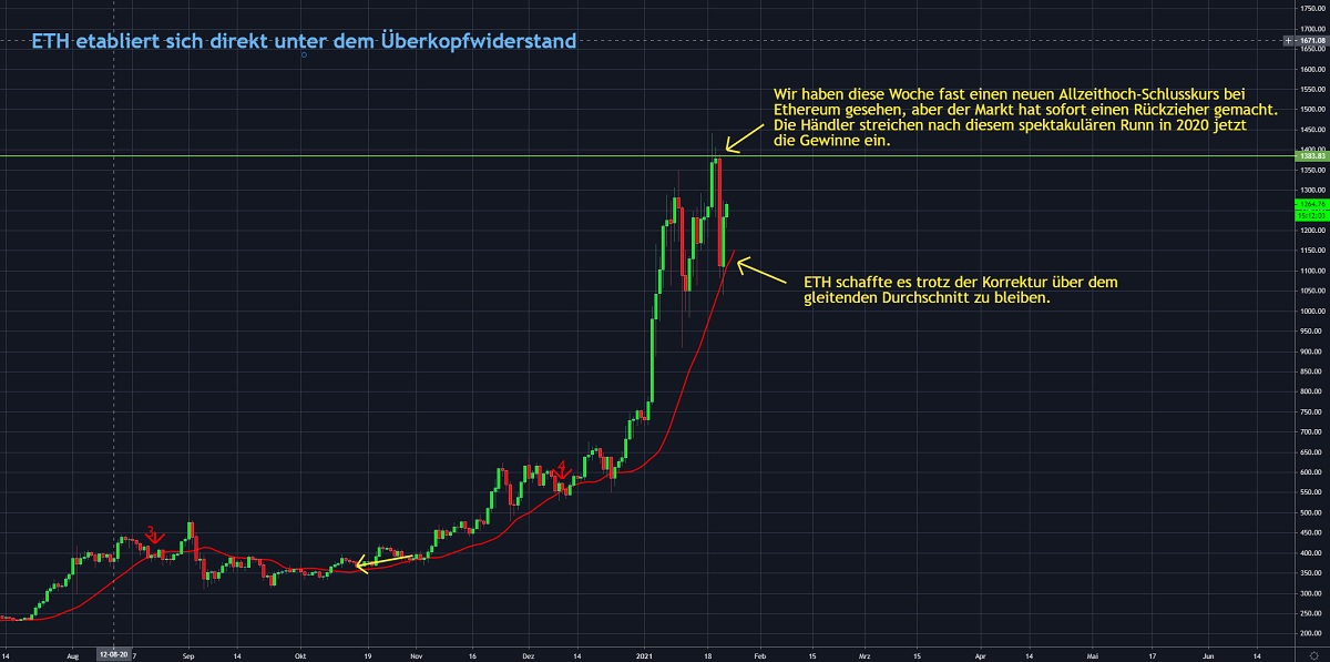 Man beachte, wie nahe Ethereum am vergangenen Dienstag an ein neues Allzeithoch gekommen ist – hervorgehoben durch die grüne horizontale Linie -, unmittelbar nachdem ETH über den jüngsten Widerstand in der Nähe von 1.300 S gestiegen war.