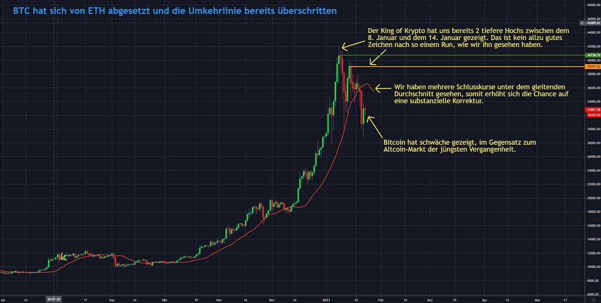 Beide sind in den letzten Tagen etwas ins Stocken geraten. Und das hat uns gemischte Signale für die unmittelbare Zukunft dieser Rallye gegeben. Die Geschichte zeigt, dass kein nachhaltiger Bullenlauf als selbstverständlich angesehen werden kann, wenn nicht mindestens eine dieser Krypto-Währungen den Weg weist.